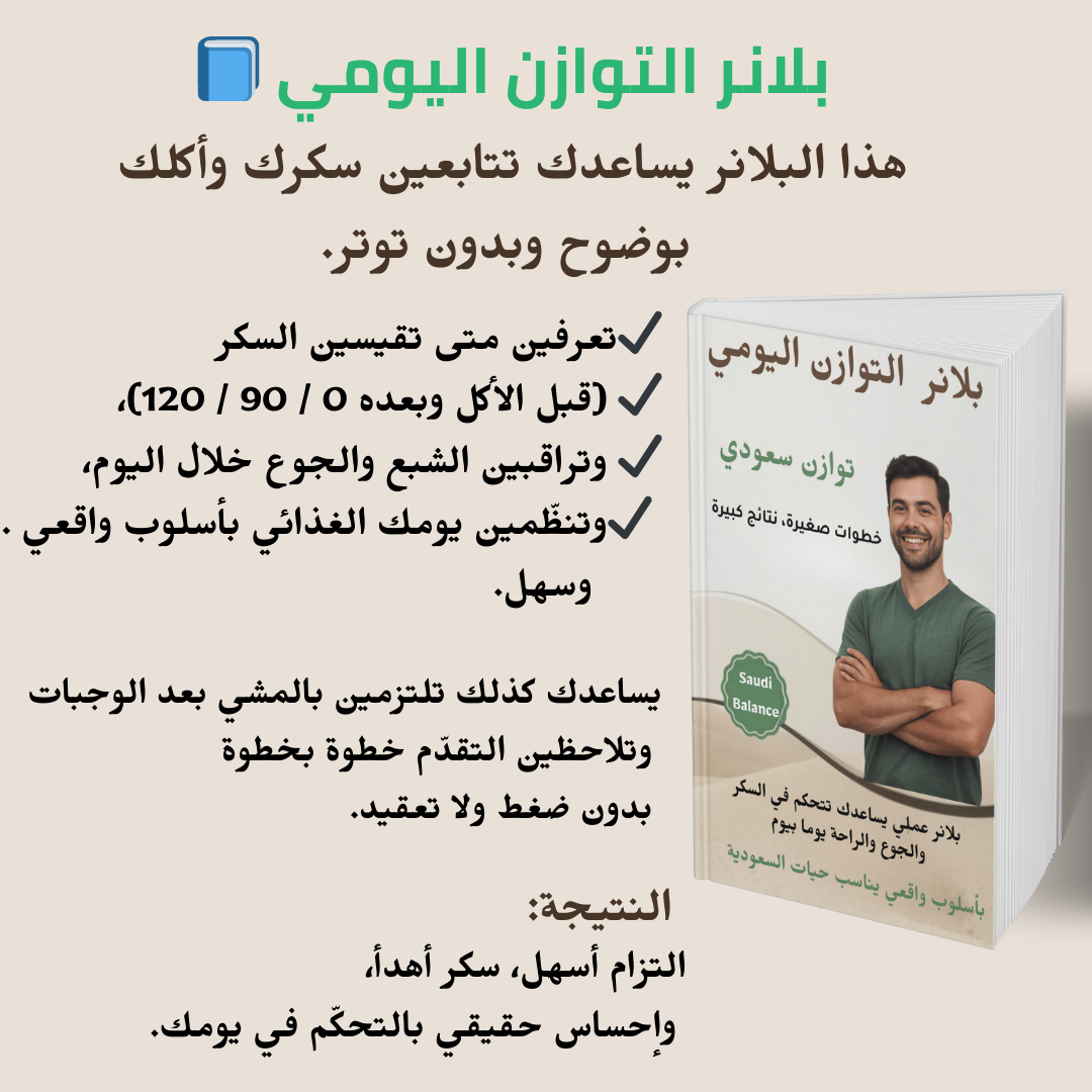 لتتبع السكر (0 / 90 / 120) + الشبع + المشي بعد الوجبة.